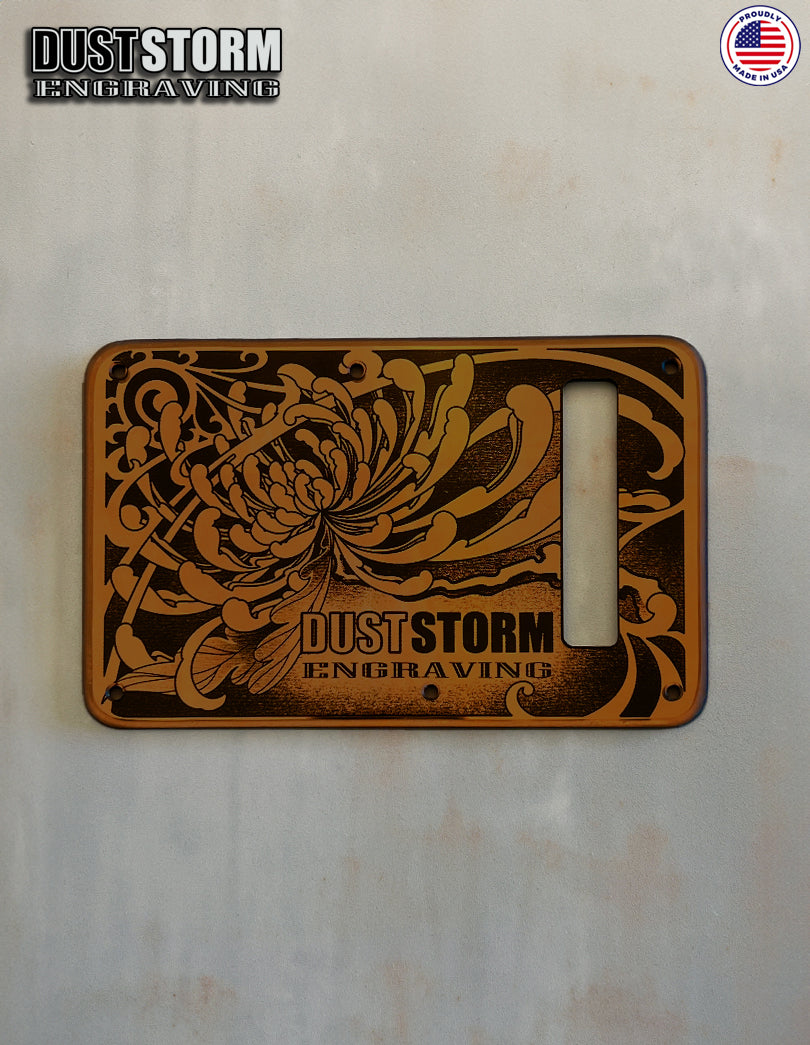 Stratocaster pickguard and tremolo cover laser cut for a precise fit, reverse-laser engraved and painted with our human generated design on acrylic mirror. The laser engraved artwork has a three-dimensional depth that no printed design can match, and the clear acrylic top layer protects the art from wear and tear. The edges are router beveled, and hand sanded for that frosted glowing edge. Lastly the 11 mounting holes are countersunk. Our custom pickguards are the perfect upgrade, replacement, or finish for your guitar build. Blending modern technology with hand craftsmanship, Dust Storm Engraving pickguards are sure to shine with their highly reflective surface and frosted edge!