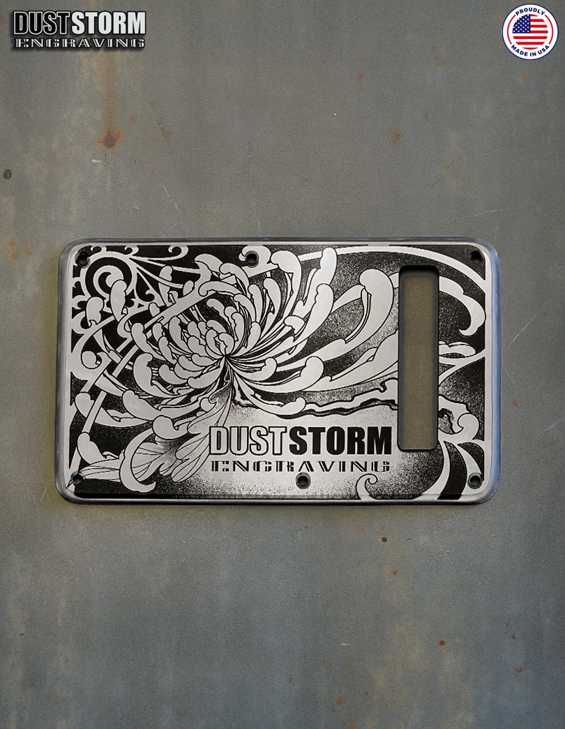 Stratocaster pickguard and tremolo cover laser cut for a precise fit, reverse-laser engraved and painted with our human generated design on acrylic mirror. The laser engraved artwork has a three-dimensional depth that no printed design can match, and the clear acrylic top layer protects the art from wear and tear. The edges are router beveled, and hand sanded for that frosted glowing edge. Lastly the 11 mounting holes are countersunk. Our custom pickguards are the perfect upgrade, replacement, or finish for your guitar build. Blending modern technology with hand craftsmanship, Dust Storm Engraving pickguards are sure to shine with their highly reflective surface and frosted edge!