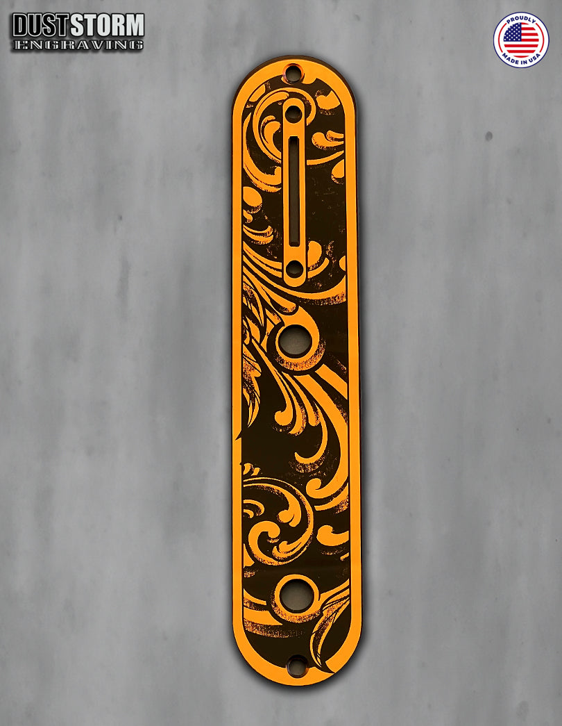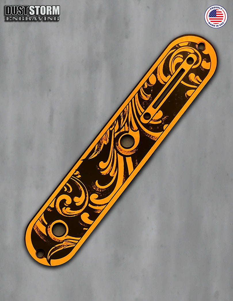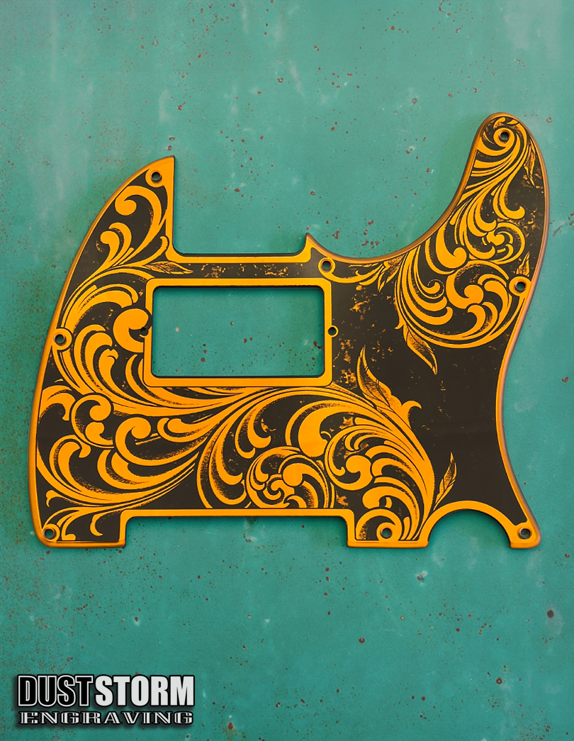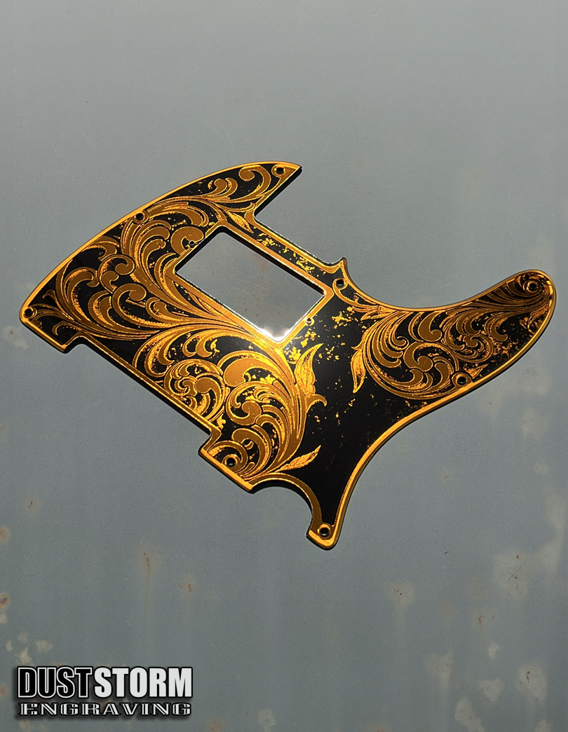 Dust Storm Engraving Pickguards with matching Toggle Control Plates are a great way to add a touch of personality and precision to your Telecaster with this beautifully engraved work of art. Designed for players who appreciate both aesthetics and functionality, this combination is the perfect upgrade or finish for your guitar build. If you want that reflective metal shine without the weight or worries about rust, then these guards are for you.