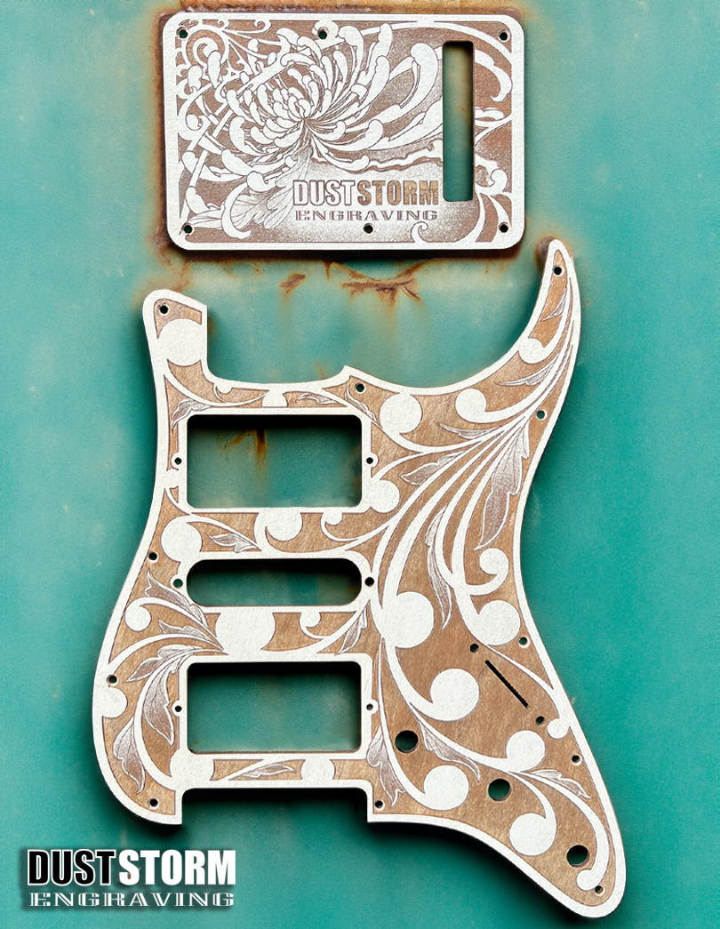 Hand drawn, laser cut and engraved then drill press countersunk. Our custom pickguards are the perfect upgrade, replacement, or finish for your guitar build. Blending modern technology with hand craftsmanship, Dust Storm Engraving pickguards are sure to change the entire look of your guitar with just one part!