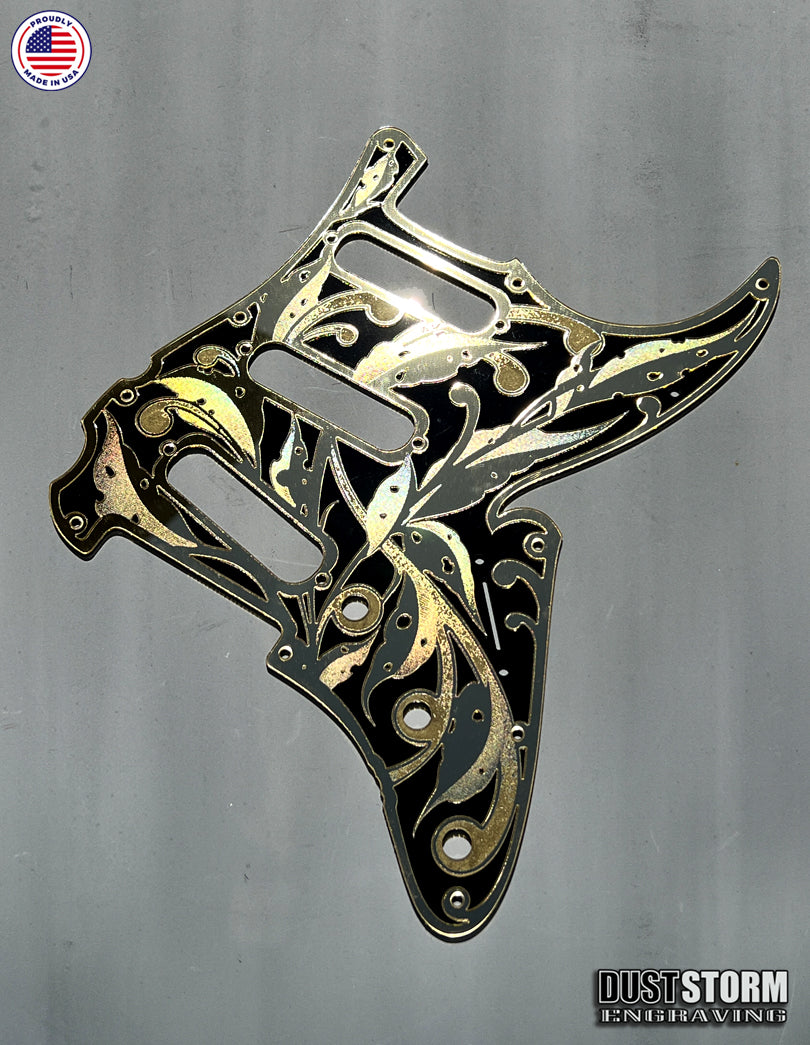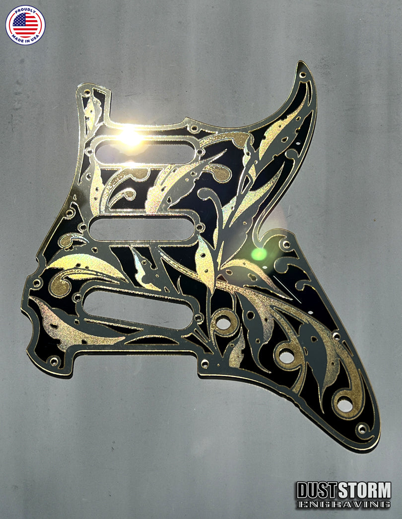 Engraved Layered Pickguard with Tremolo Cover in Acrylic Gold Mirror with Glossy Black for Fender Stratocaster HSH, HSS, SSS Setups Available