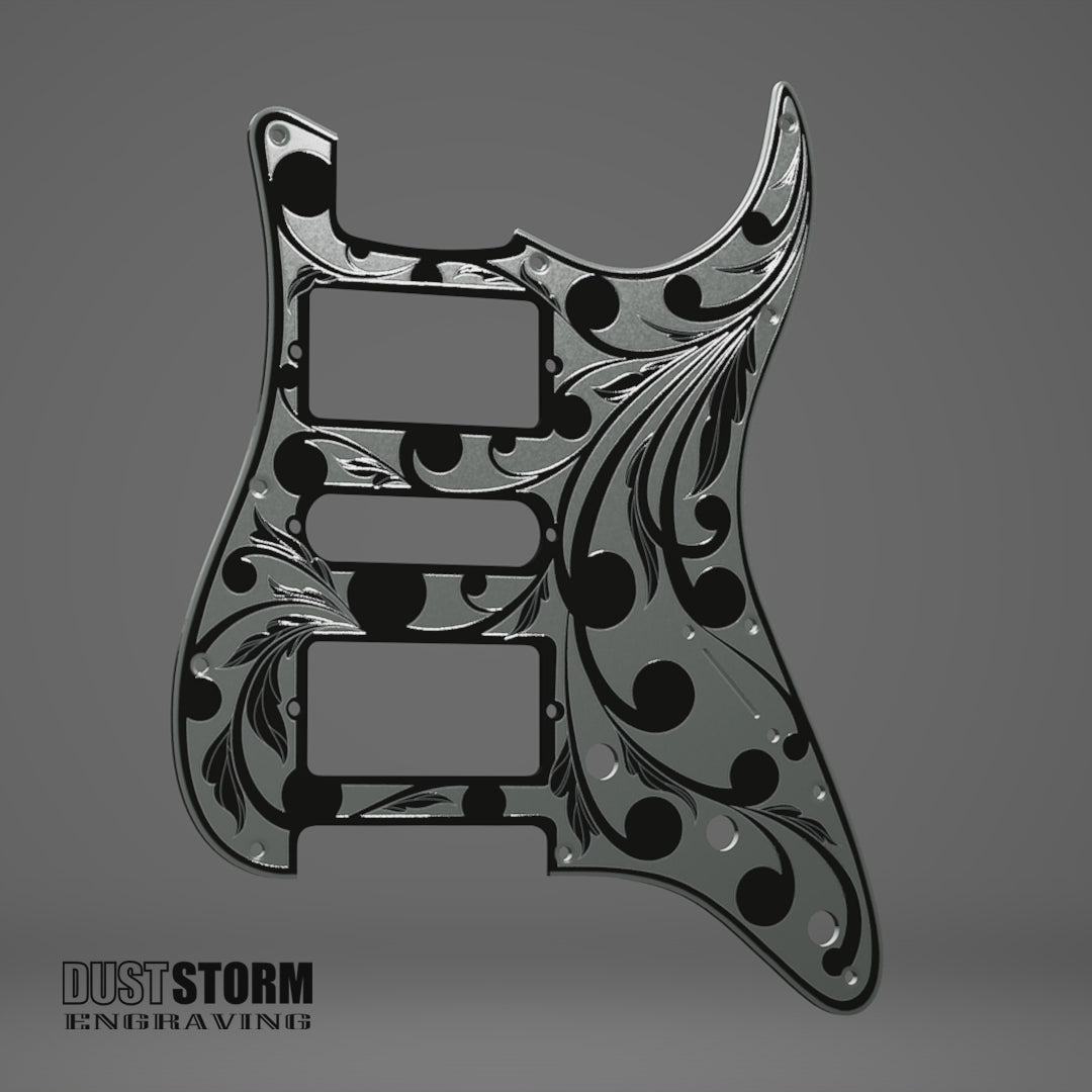 Stratocaster pickguard and tremolo cover laser cut for a precise fit. Then laser engraved and etched with our human generated design on solid color acrylic. The laser engraved artwork has a three-dimensional depth that no printed design can match and takes on many looks when reflecting light. The edges are router beveled, and hand sanded for a human crafted finish. Finally, the 11 mounting holes are countersunk. Our custom pickguards are the perfect upgrade, replacement, or finish for your guitar build. Blending modern technology with hand craftsmanship, Dust Storm Engraving pickguards are sure to shine with their highly reflective surface!