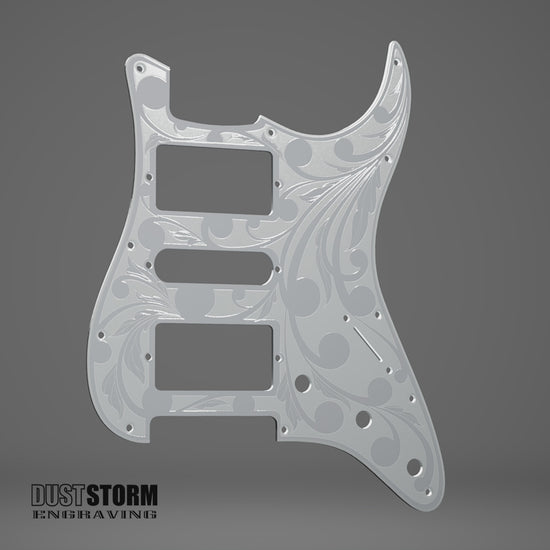 Engraved Pickguard & Free Tremolo Cover in Glossy Acrylic White Design #2 for Fender Stratocaster HSH, HSS, SSS Setups Available