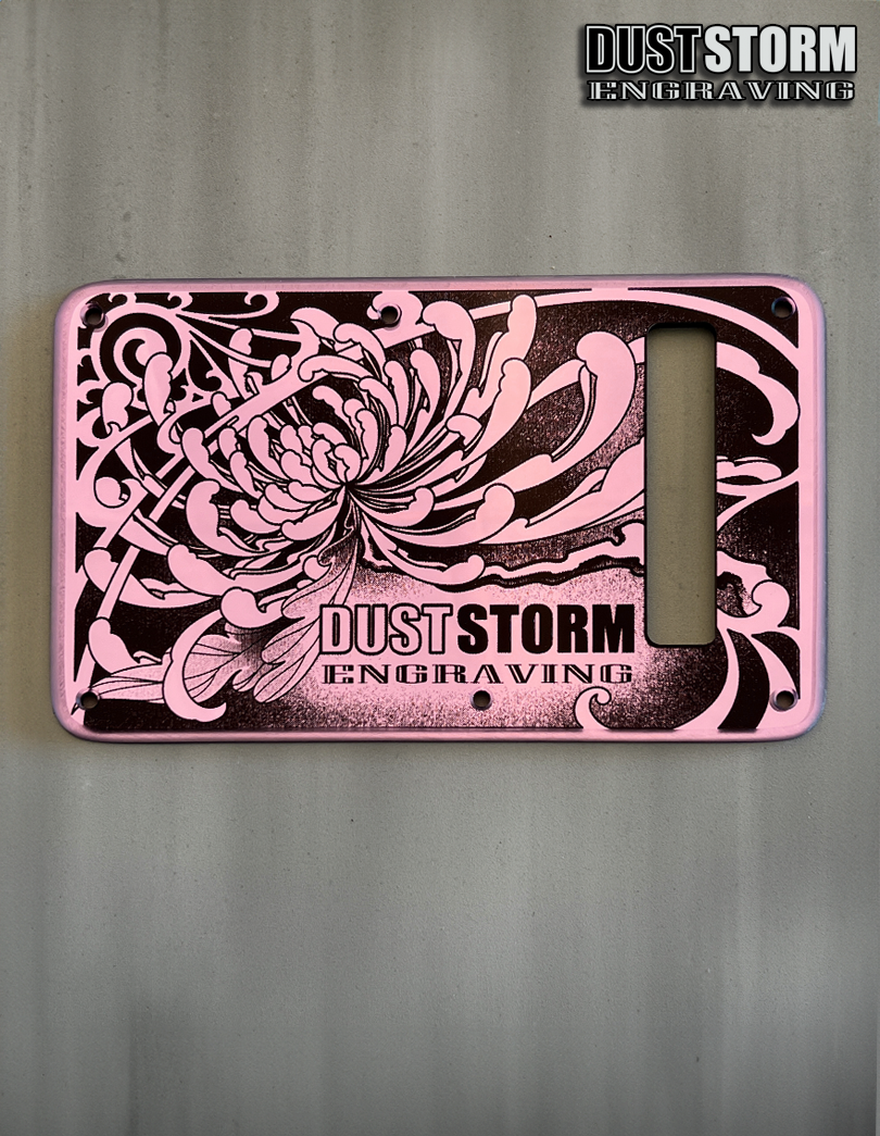 Stratocaster pickguard and tremolo cover laser cut for a precise fit, reverse-laser engraved and painted with our human generated design on acrylic mirror. The laser engraved artwork has a three-dimensional depth that no printed design can match, and the clear acrylic top layer protects the art from wear and tear. The edges are router beveled, and hand sanded for that frosted glowing edge. Lastly the 11 mounting holes are countersunk. Our custom pickguards are the perfect upgrade, replacement, or finish for your guitar build. Blending modern technology with hand craftsmanship, Dust Storm Engraving pickguards are sure to shine with their highly reflective surface and frosted edge!
