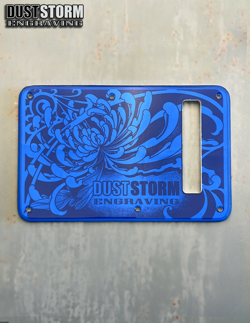 Stratocaster pickguard and tremolo cover laser cut for a precise fit, reverse-laser engraved and painted with our human generated design on acrylic mirror. The laser engraved artwork has a three-dimensional depth that no printed design can match, and the clear acrylic top layer protects the art from wear and tear. The edges are router beveled, and hand sanded for that frosted glowing edge. Lastly the 11 mounting holes are countersunk. Our custom pickguards are the perfect upgrade, replacement, or finish for your guitar build. Blending modern technology with hand craftsmanship, Dust Storm Engraving pickguards are sure to shine with their highly reflective surface and frosted edge!