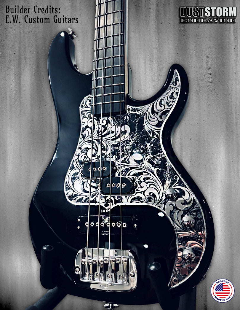 Our custom pickguards are the perfect upgrade, replacement, or finishing touch for your guitar build. Blending modern technology with hand craftsmanship, Dust Storm Engraving pickguards are made for players who want their instrument to stand out. Each handcrafted acrylic mirror pickguard is designed to elevate your bass guitar’s aesthetic while delivering durable, stage‑ready performance.
