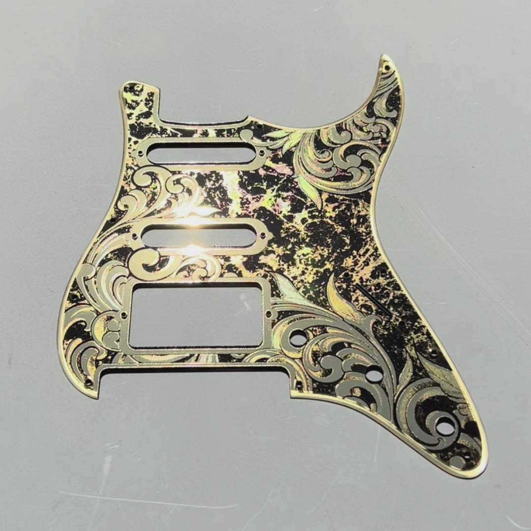 Laser‑Engraved Stratocaster Pickguard for Lari Basilio Pickup Set with Trembucker at Bridge — Gold Acrylic Mirror + Tremolo Cover